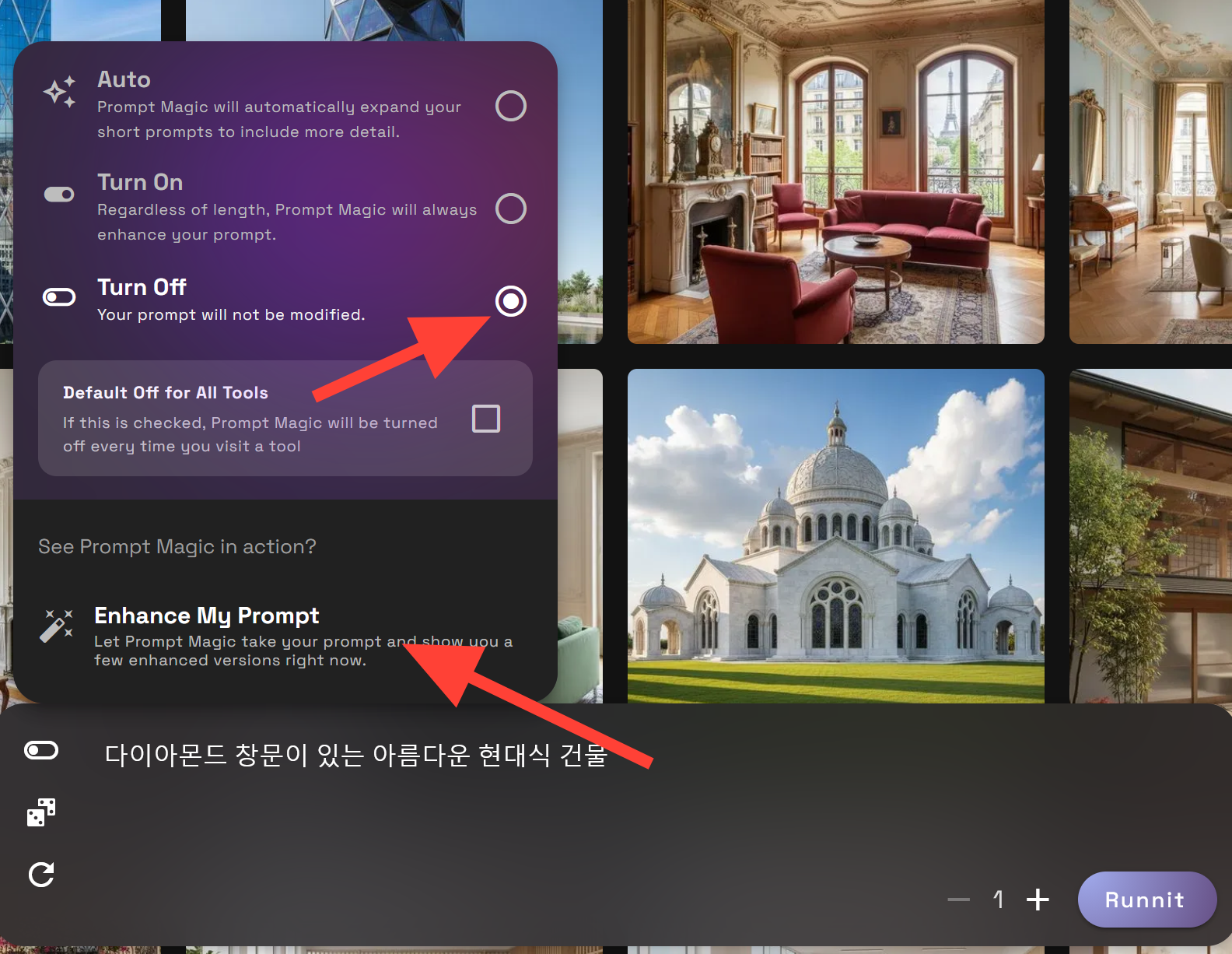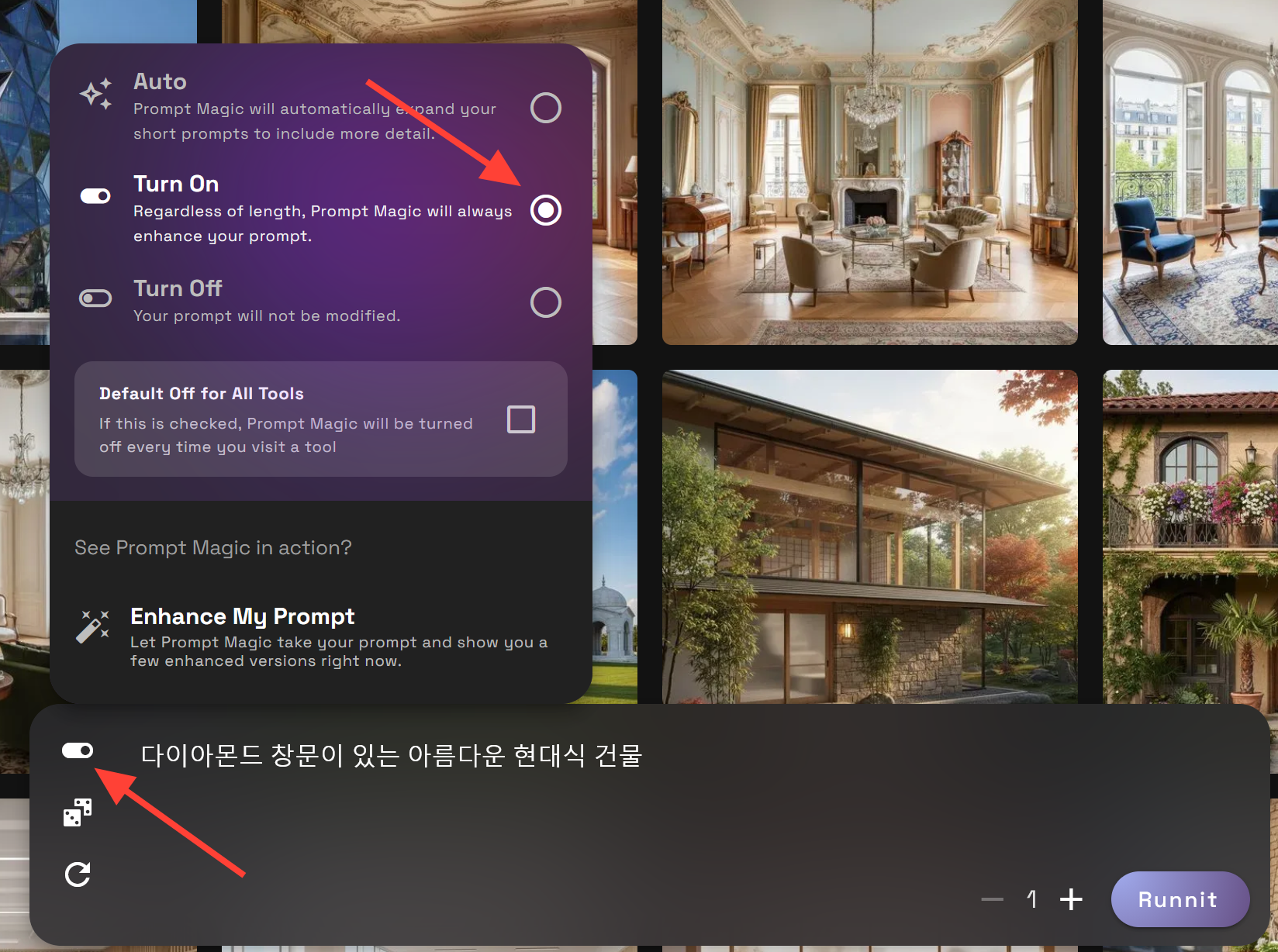 To use Magic Prompt click on the magic prompt button. Then click on Turn On. Then click Runnit to render your image.