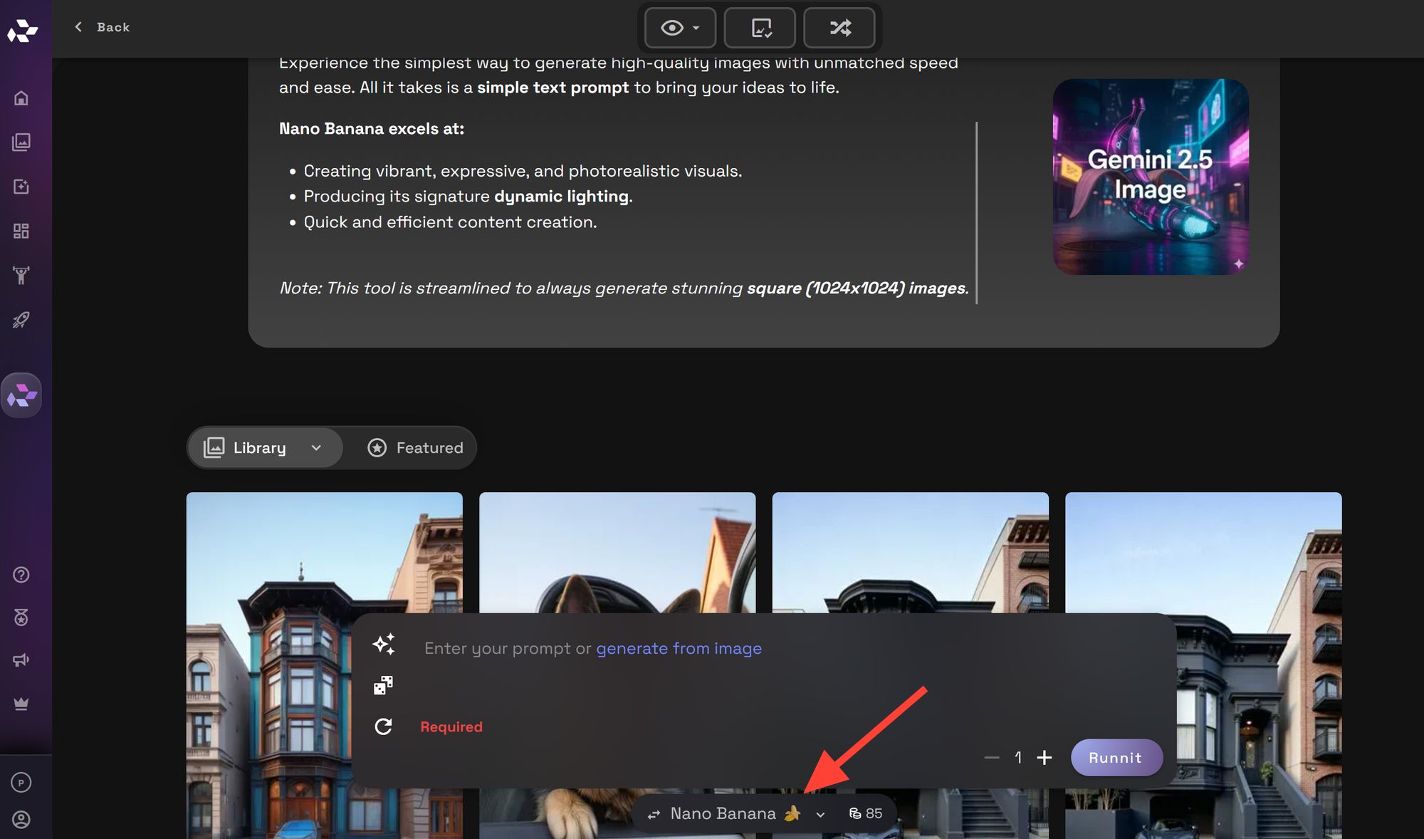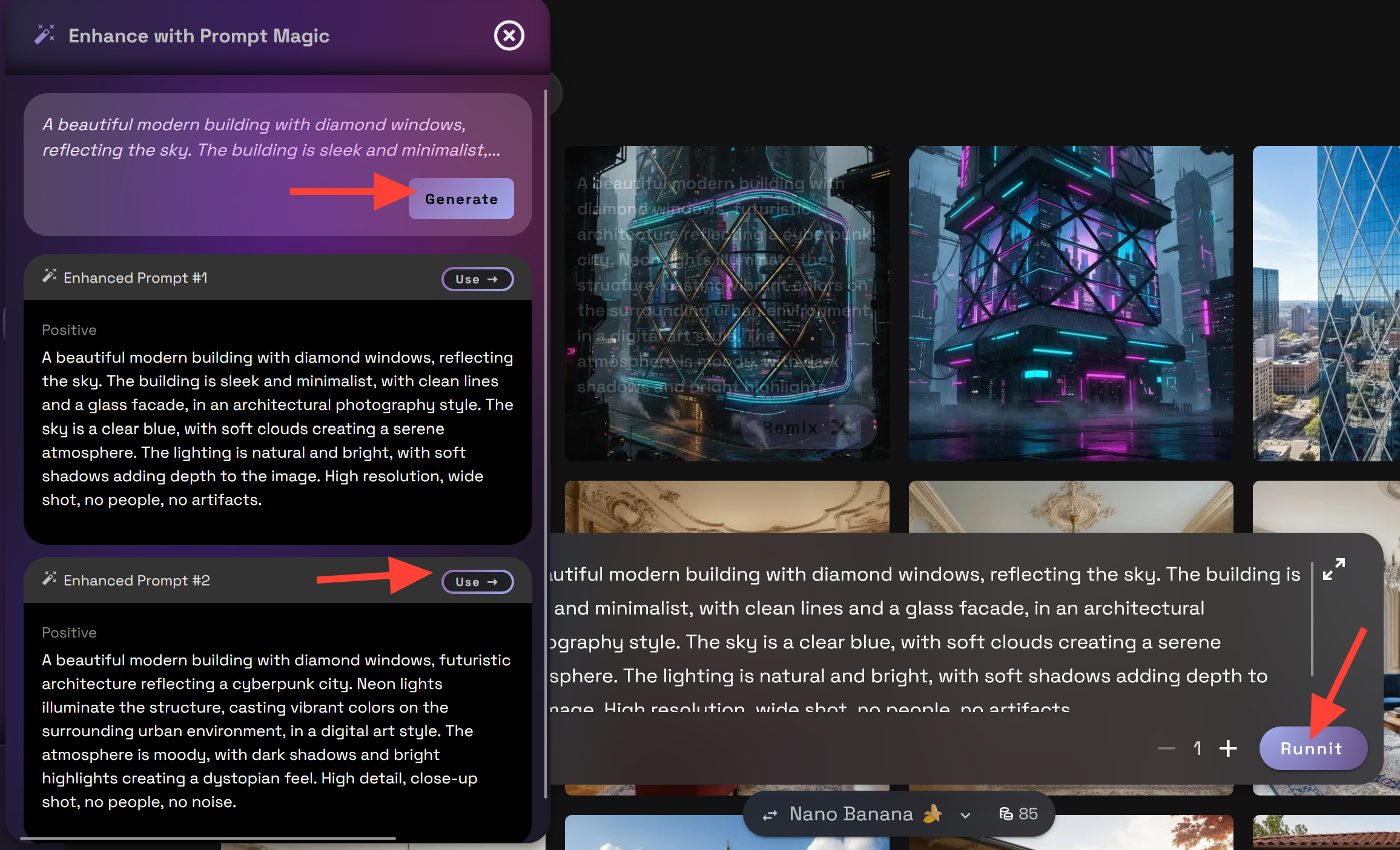 Then click on Generate. It will generate for you two optional prompts. Click Use on the option that you like. This will apply your prompt to the tool. To render your image click Runnit.