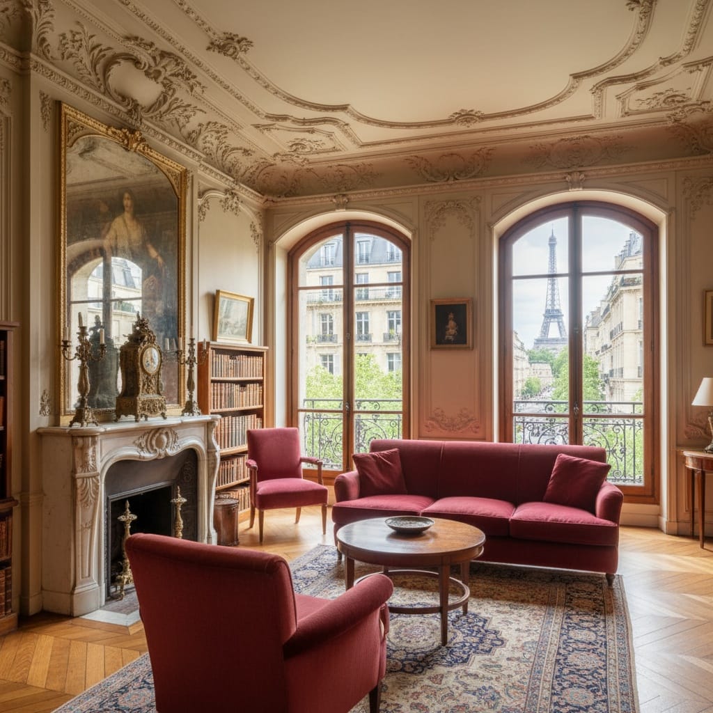 Prompt Enhancer Prompt: A grand Haussmann-style living room, showcasing ornate moldings, an antique marble fireplace adorned with vintage decor, and large windows overlooking a Parisian street. The scene is captured in a photorealistic style, with natural lighting emphasizing the textures of the velvet furniture and polished wood floors. Warm tones, high detail, shallow depth of focus.