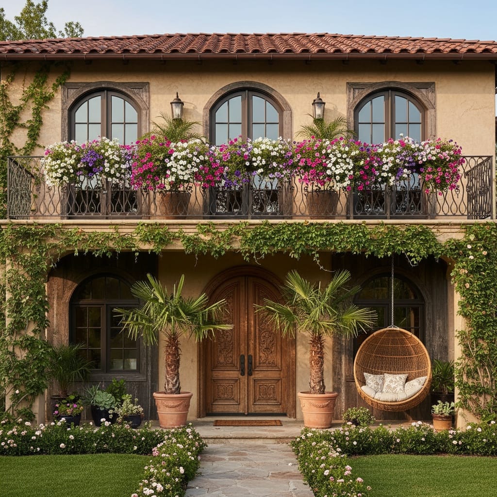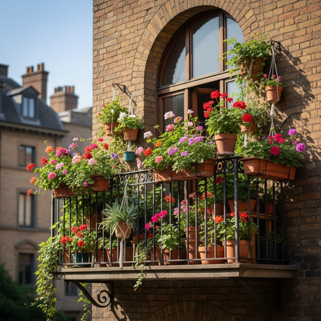 English Prompt Magic: Residential facade with a cozy balcony overflowing with lush potted plants and vibrant flowers, bathed in soft sunlight, creating a welcoming and serene atmosphere, high quality, natural lighting, vibrant colors, detailed textures, outdoor setting, daytime, medium shot, shallow depth of focus, plants, no people, architectural photography, no noise, no artifacts.