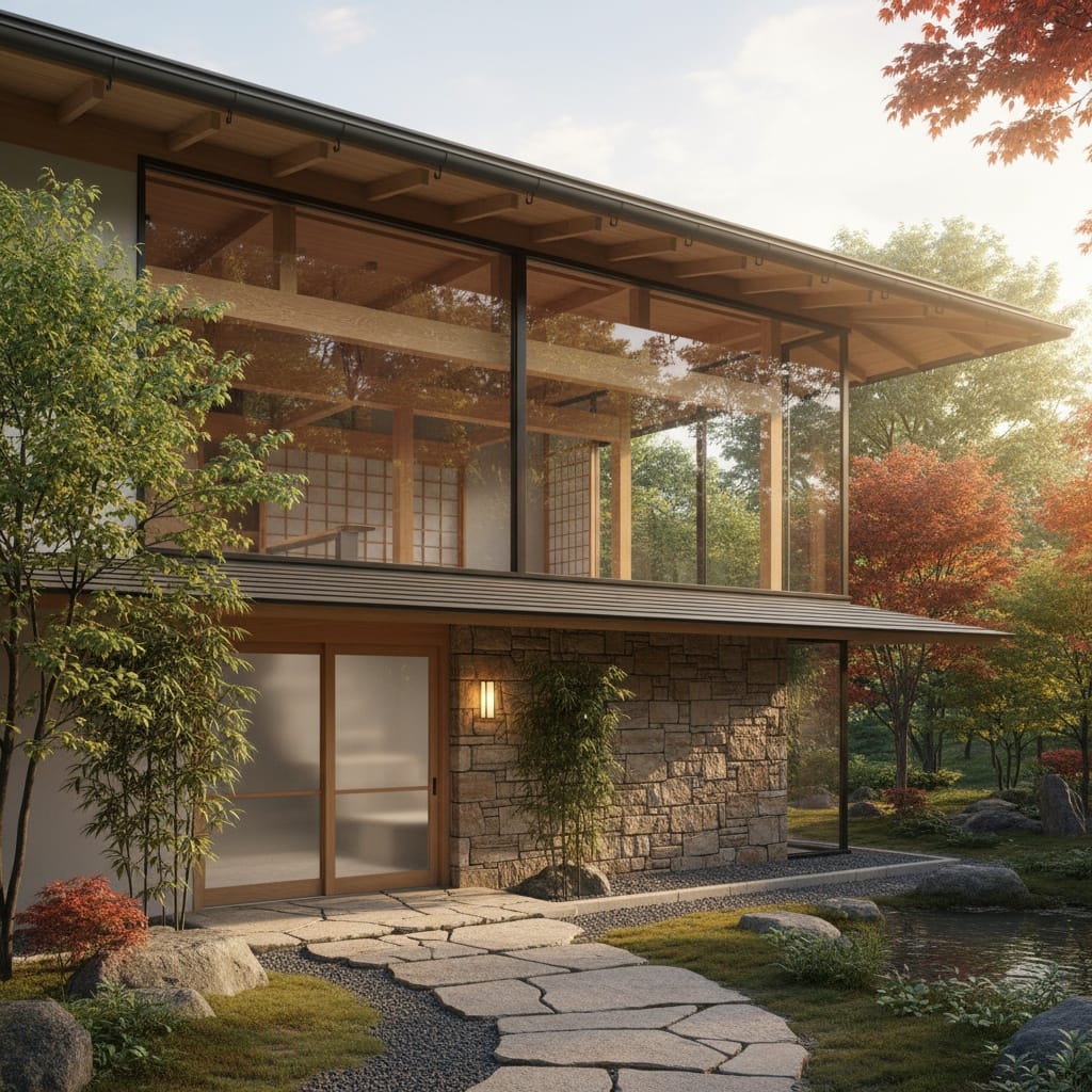 日本語 Prompt: 和モダンの建物、大きな窓、自然素材