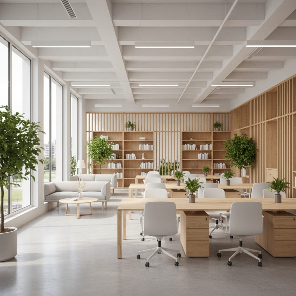 Español Prompt: Oficina moderna, luz natural, madera clara