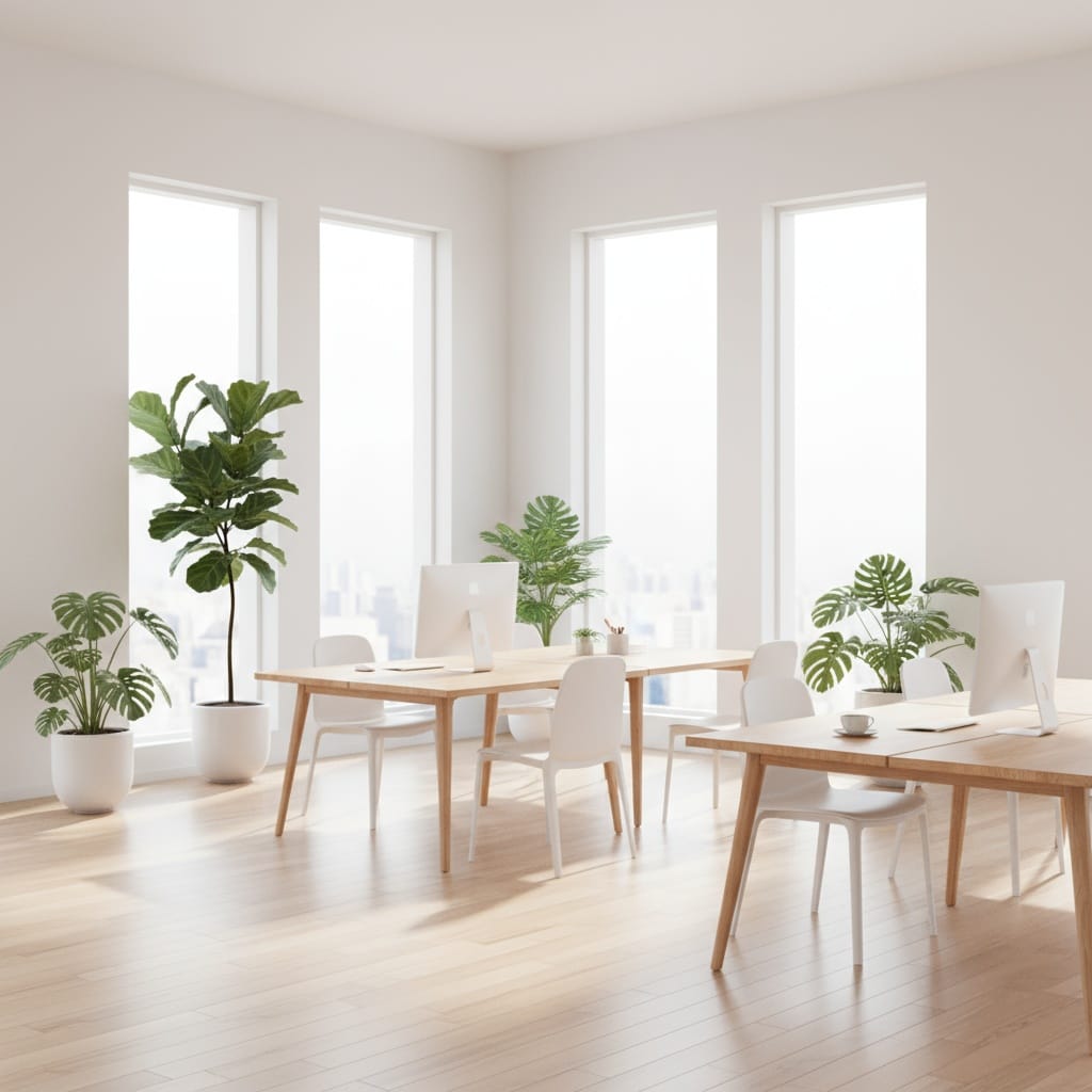 English Prompt Magic: Modern office, natural lighting, light wood, large windows, potted plants, white walls, wooden floor, no people, clean, organized, bright sunlight, serene atmosphere, indoor setting, high resolution, photo (medium).