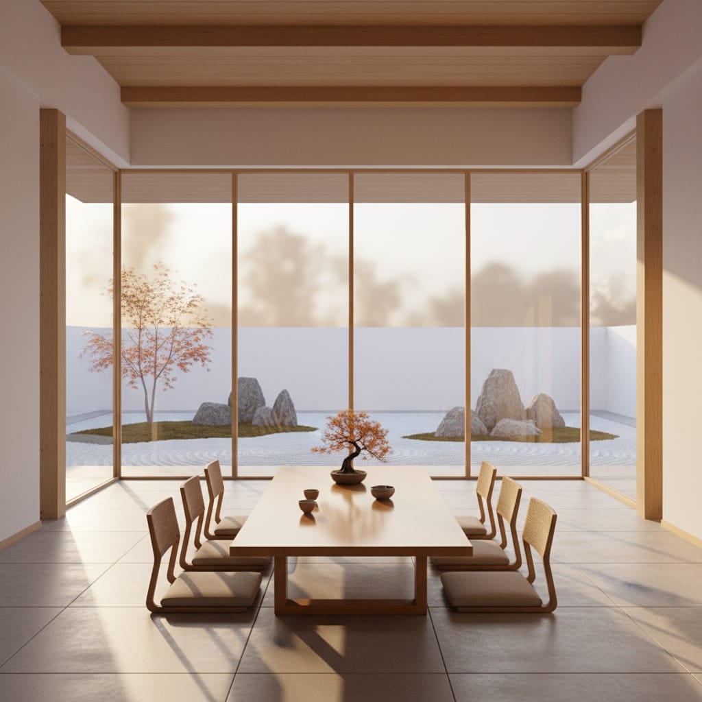 English Prompt: Japanese modern-style building, large windows, natural materials