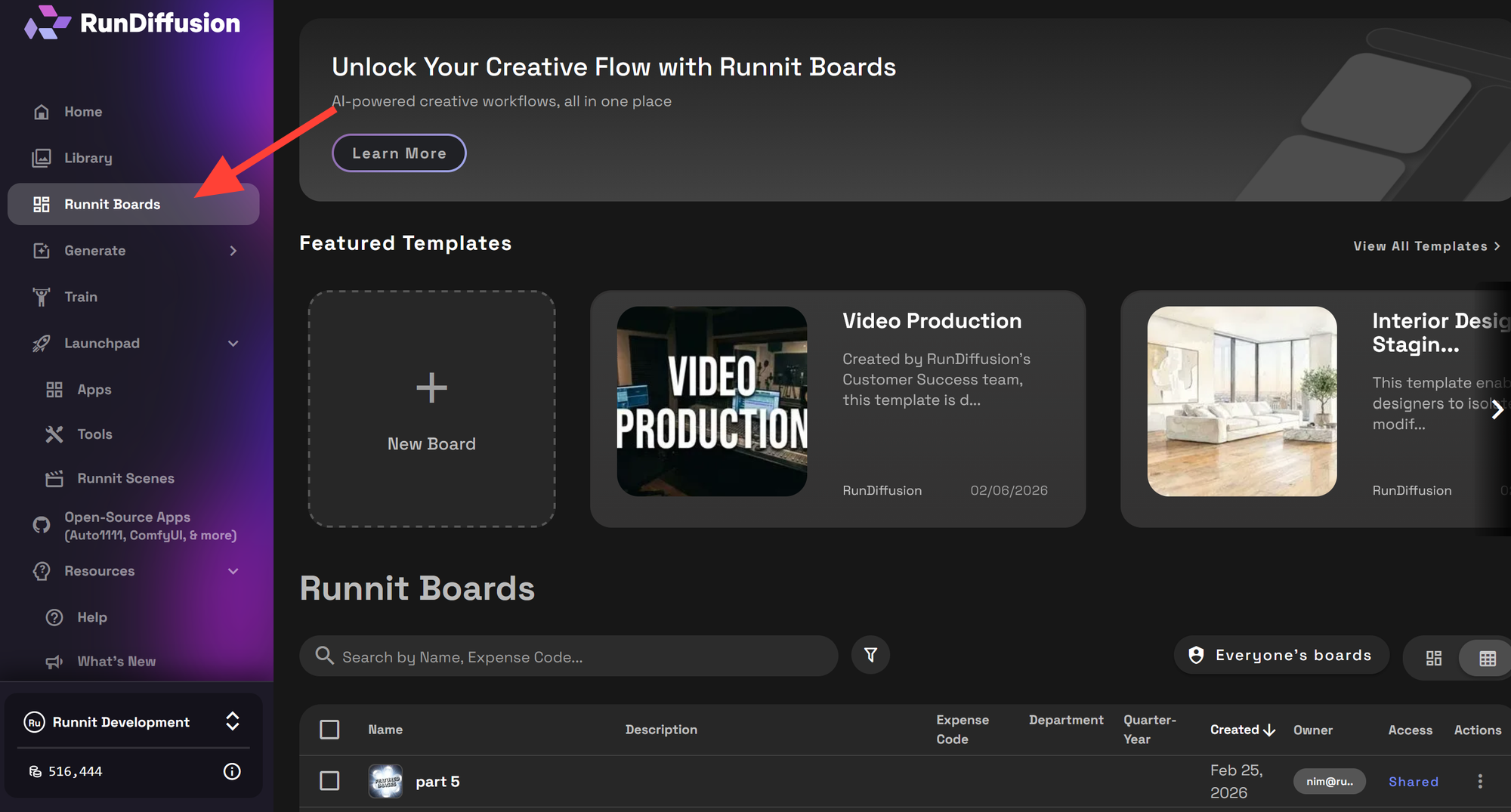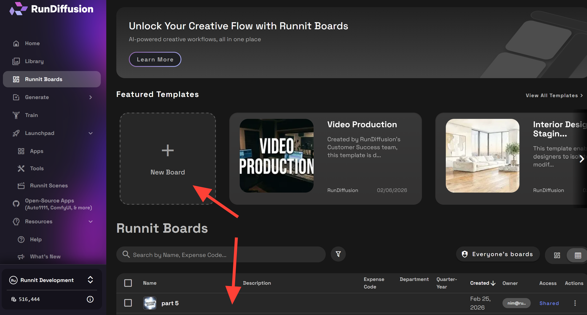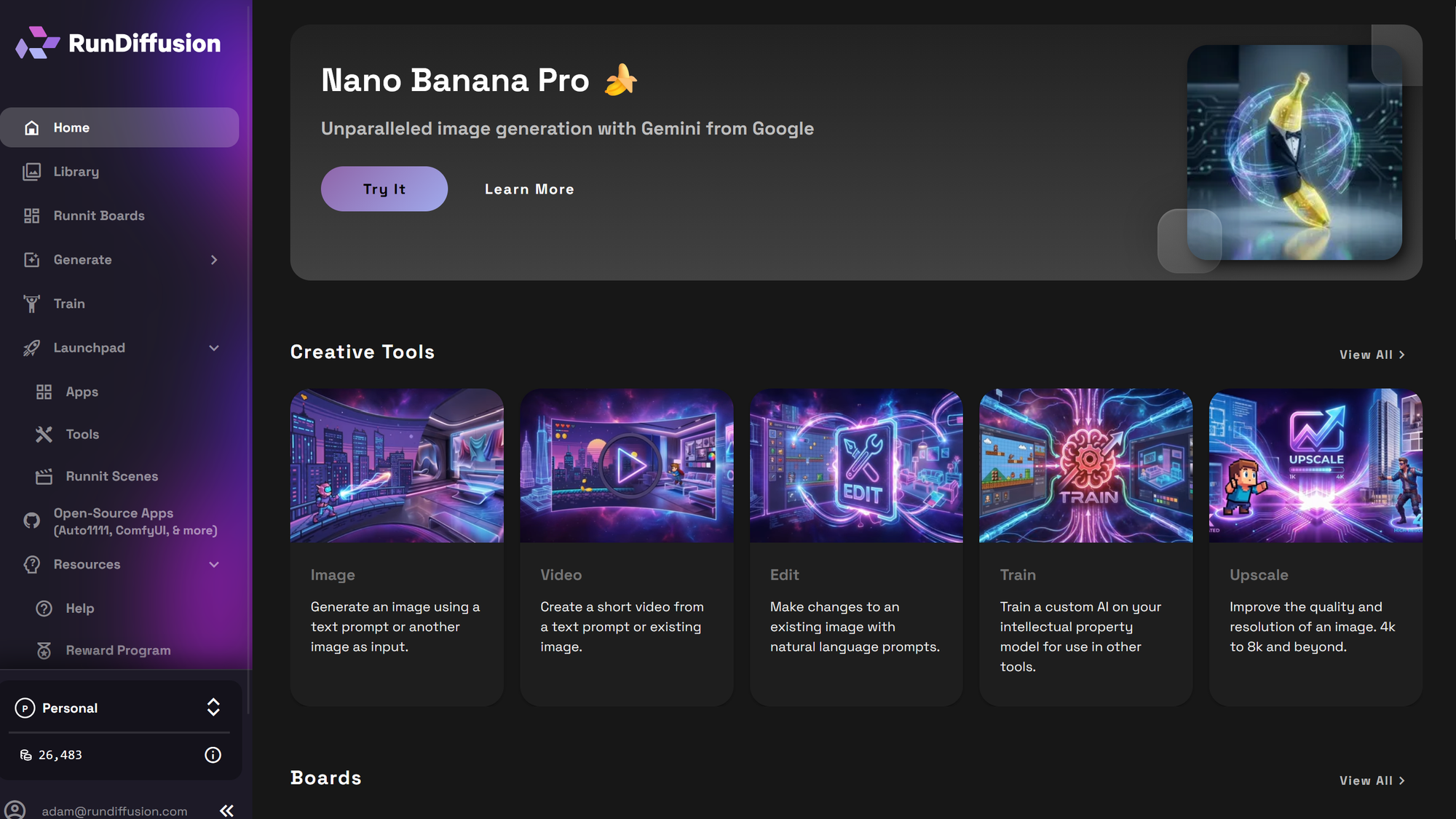 One of the most effective ways to use Nano Banana 2 on RunDiffusion is within Runnit Boards. Boards allow you to organize prompts, reference images, outputs, and revisions into a structured workspace.