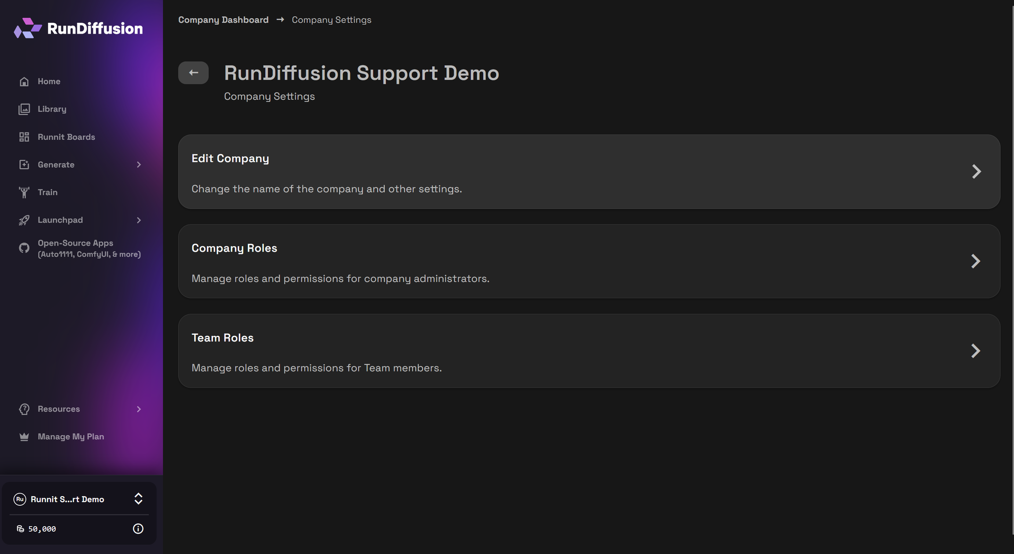 Team Roles in RunDiffusion allows Company administrators to define exactly what each member can access and control. Roles determine permissions across Team management, Generation Tools, and the Open-Source Apps platform.
