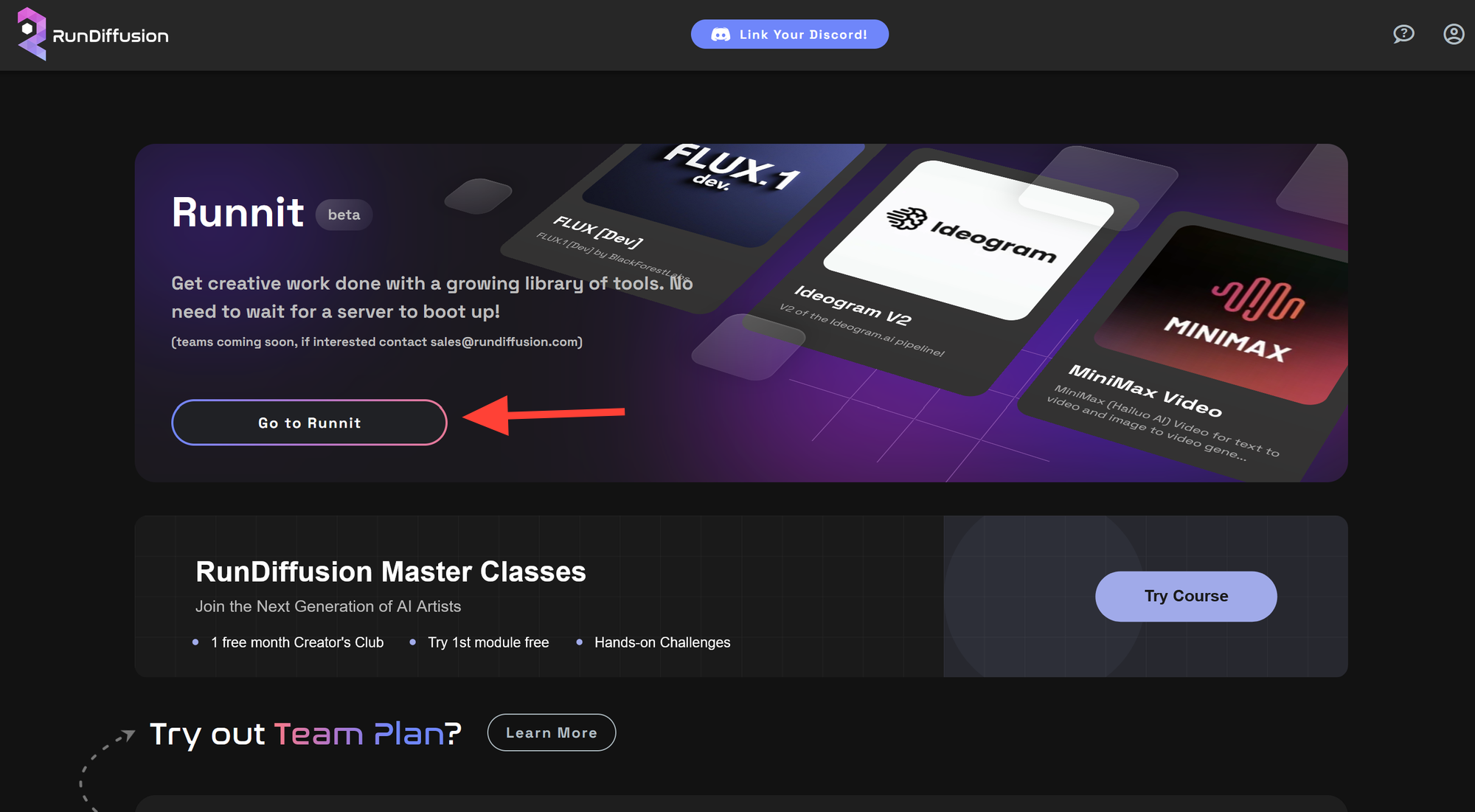To begin, navigate to Runnit from the RunDiffusion website. If you don’t have an account yet, you’ll need to create one and log in. Click Go to Runnit to access the Runnit interface.