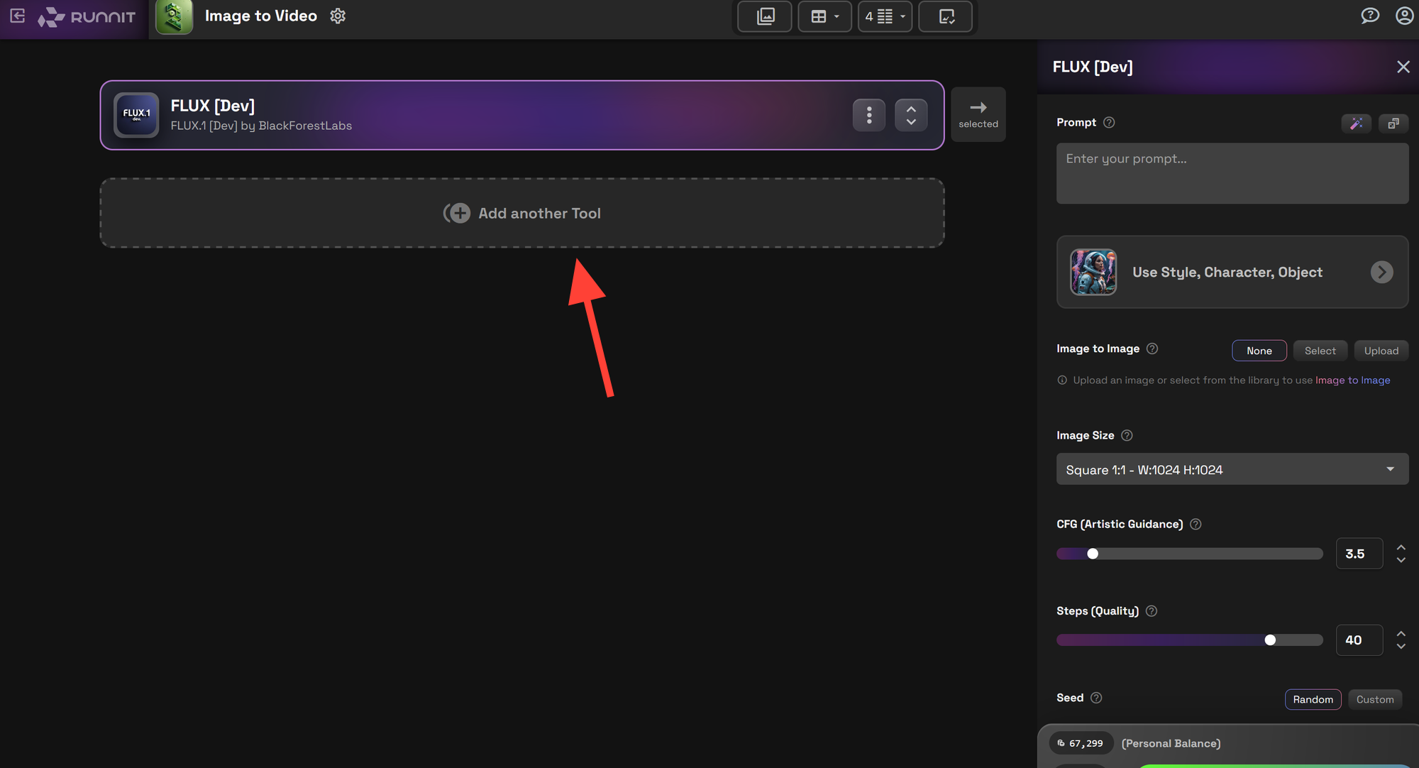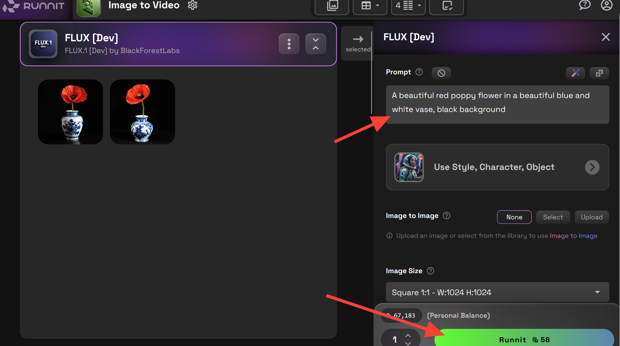 Type a prompt into the text box. Click Runnit to generate your image. Your generated image will appear on the left side of the tool panel.