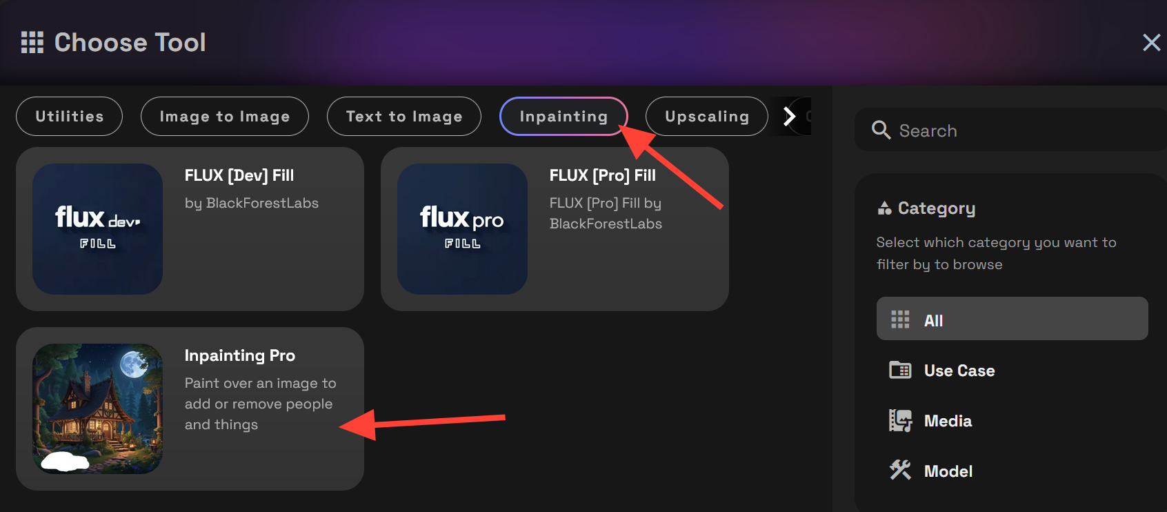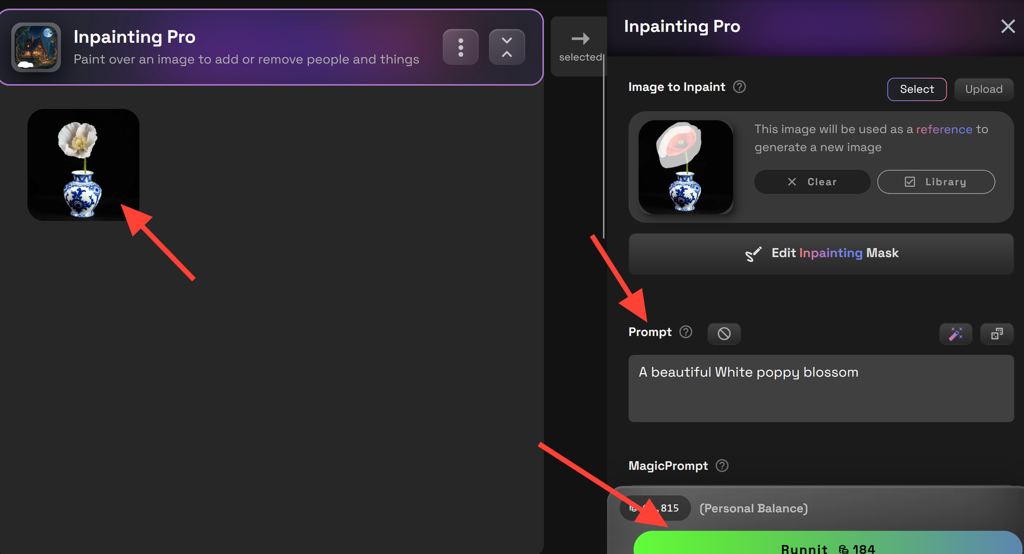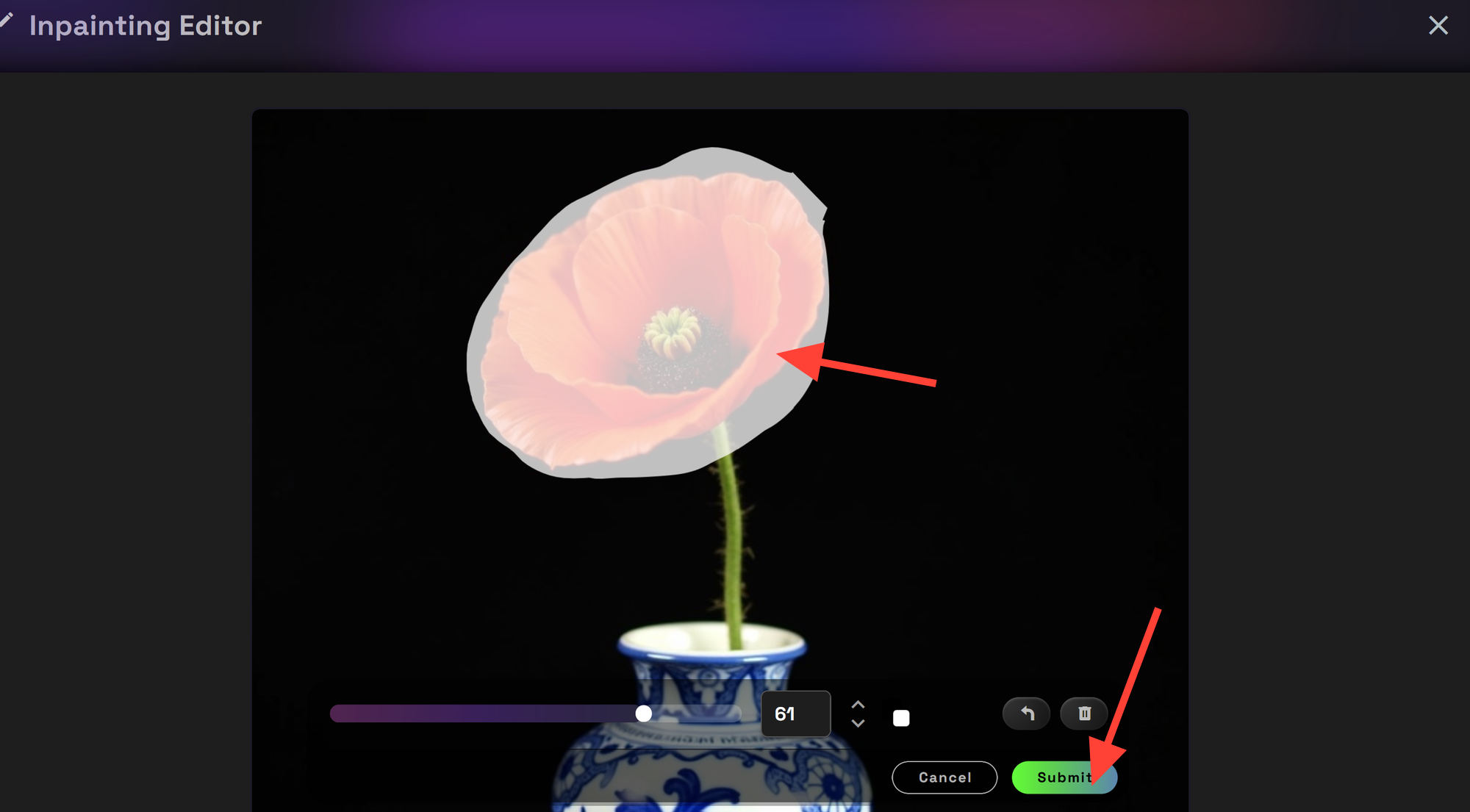 Use the Inpainting Editor to draw a mask over the section you wish to edit, then click Submit.