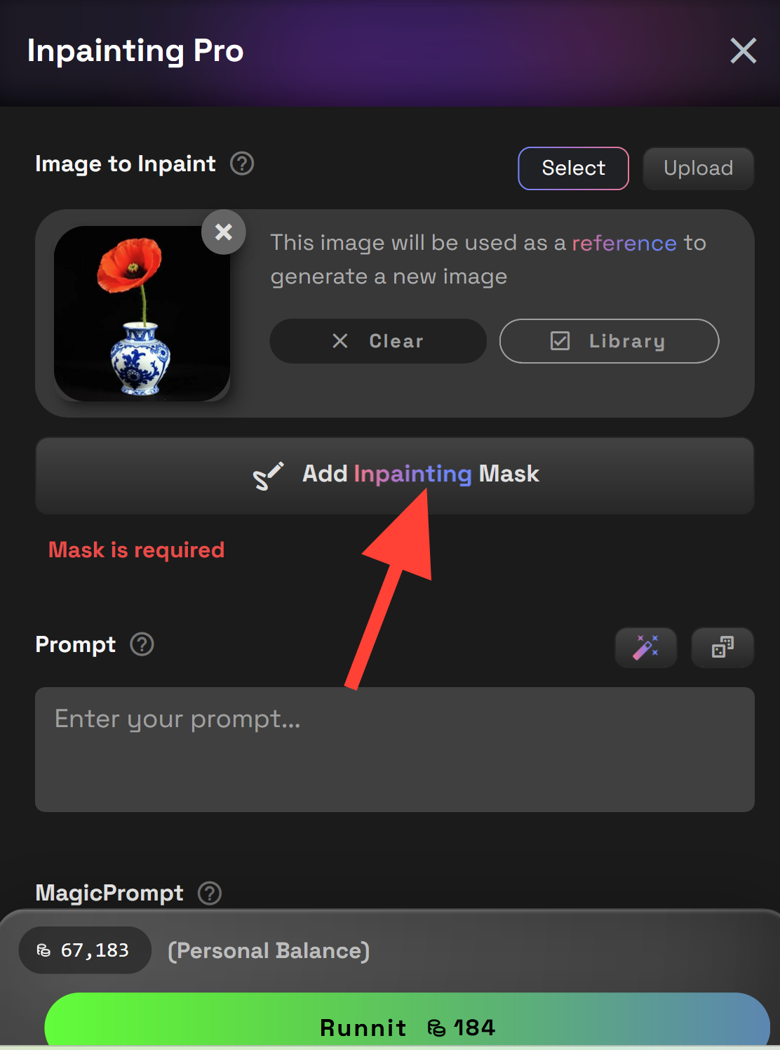 Click Add Inpainting Mask to highlight the area you want to modify.