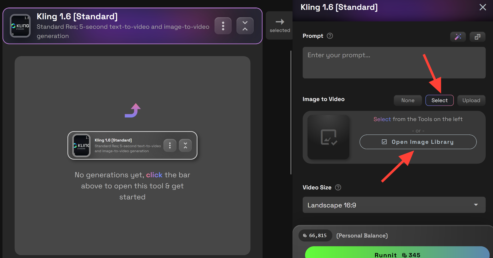 Minimize the other tools and expand the video tool (in this case, Kling 1.6 [Standard]). Click Select, then open the Image Library.