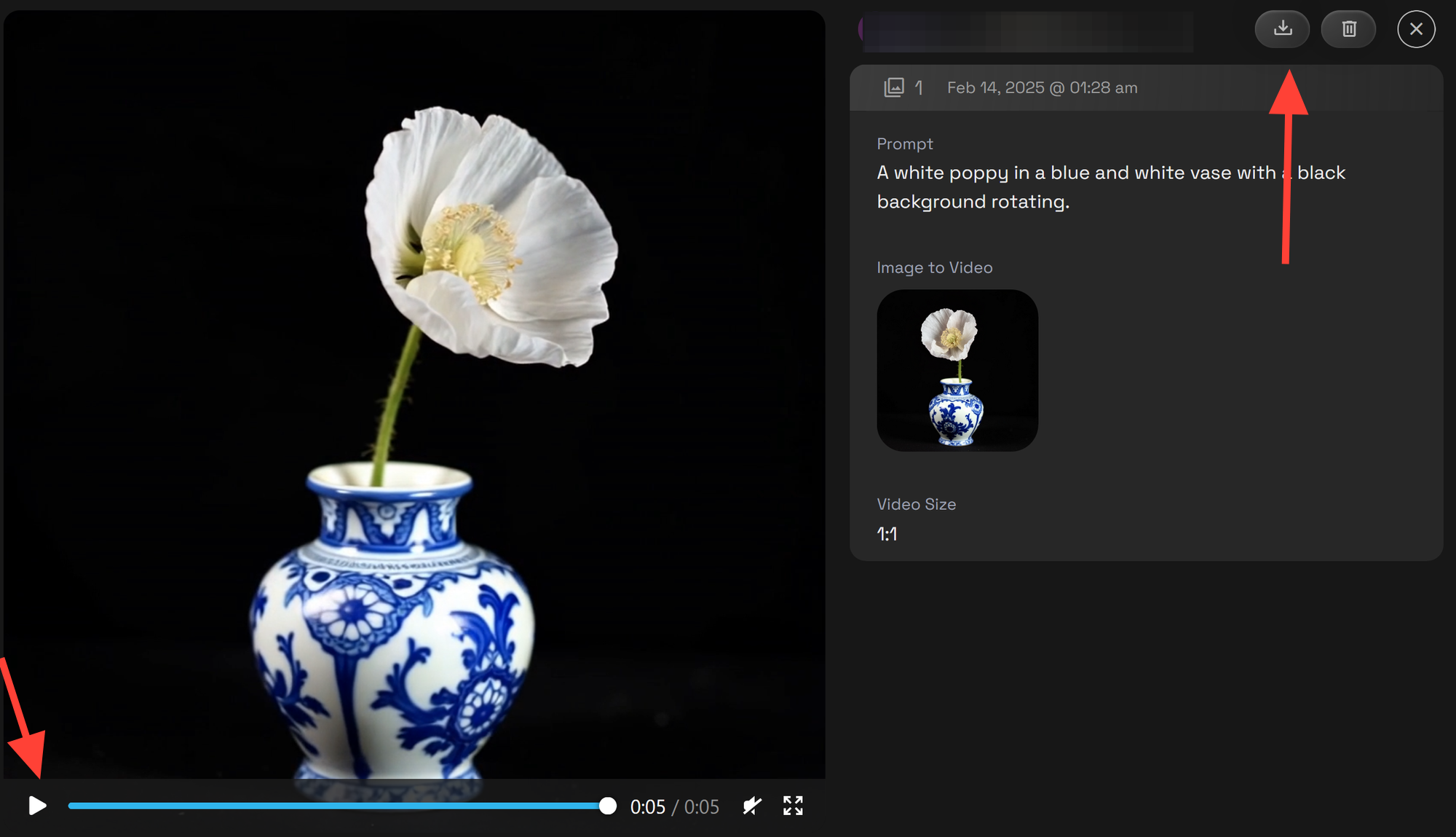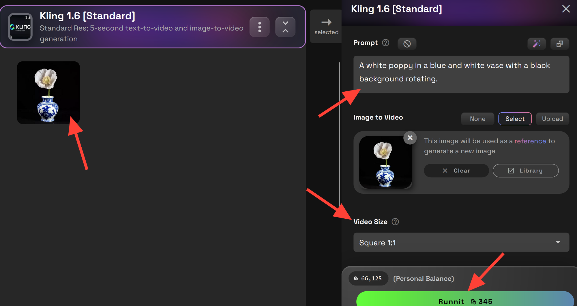 Enter a prompt to guide the animation. Click Video Size, then select Square 1:1 to match the image dimensions. Click Runnit to generate the video. Once the video is processed, click on it from the left panel to preview it.
