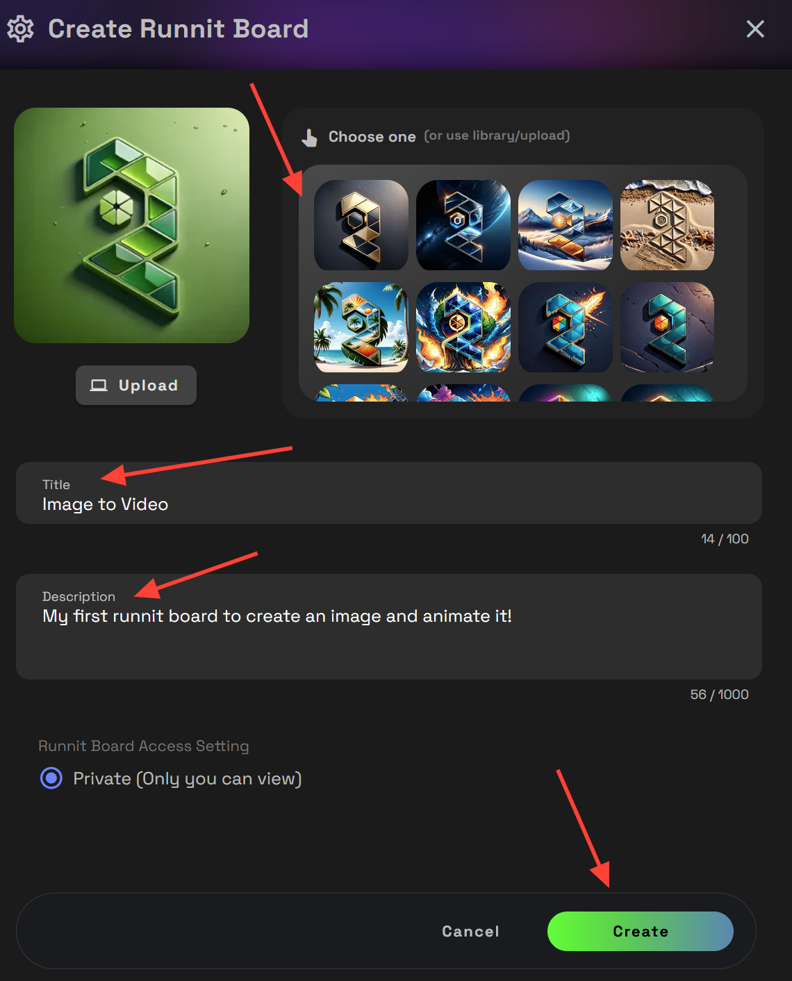 Customize your board by: Selecting or uploading an image, Adding a title and Writing a short description. Click Create to finalize your board setup.