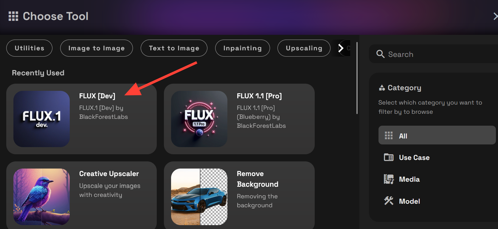 On the Choose Tool screen: For image generation, select Flux.1 Dev (or choose Juggernaut XII or another available tool).