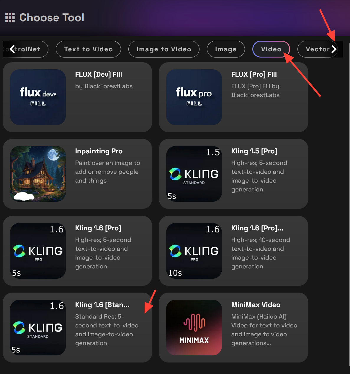 Use the side arrows to navigate to the Video filter. Select a video tool of your choice.