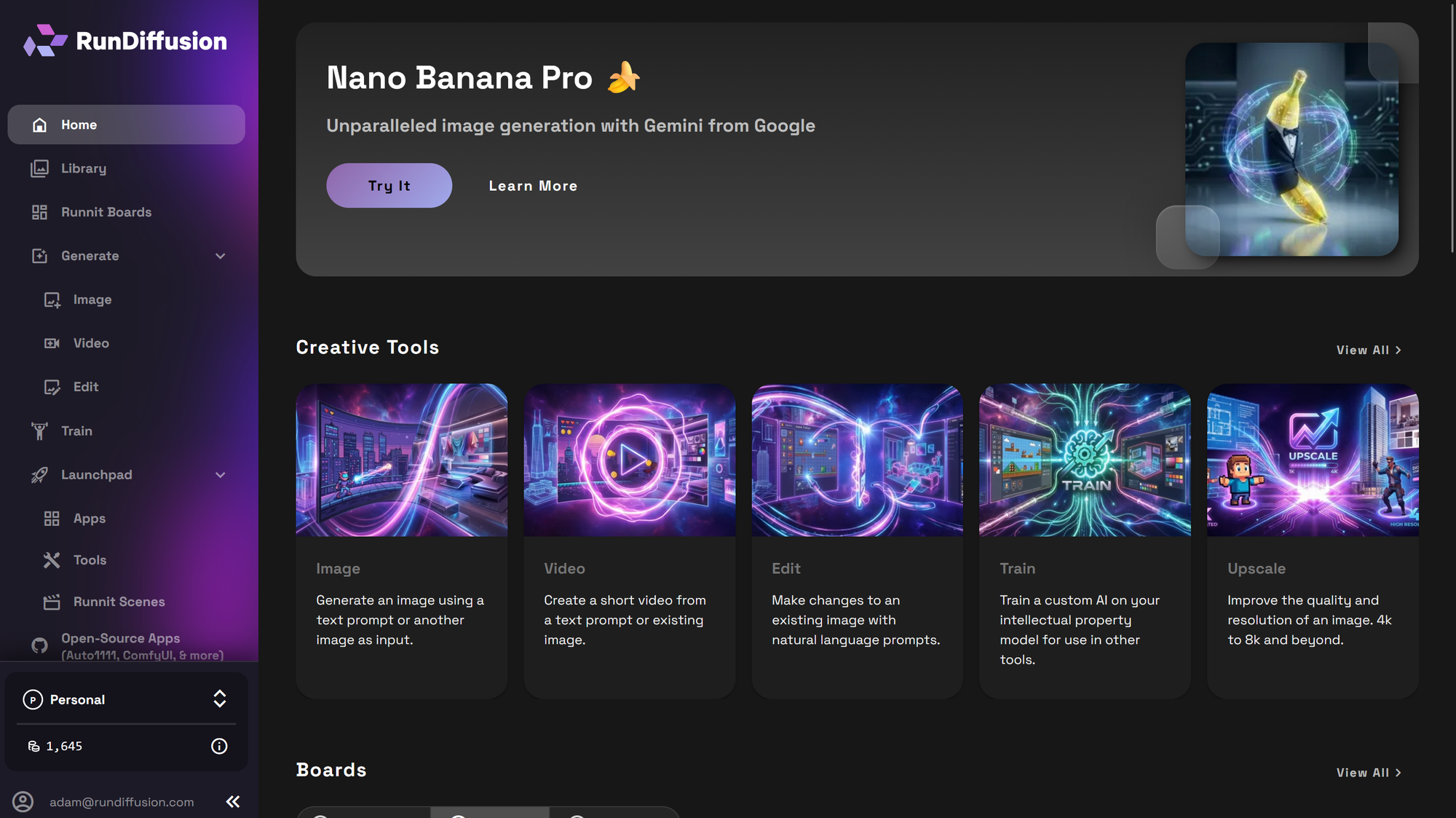 Runnit is your all-in-one creative workspace on RunDiffusion. It brings together powerful tools for AI image generation, video creation, model training, editing, and project organization. Everything is accessible directly from your browser. Whether you're creating visuals for personal exploration or professional work, Runnit simplifies your workflow and scales with your needs.