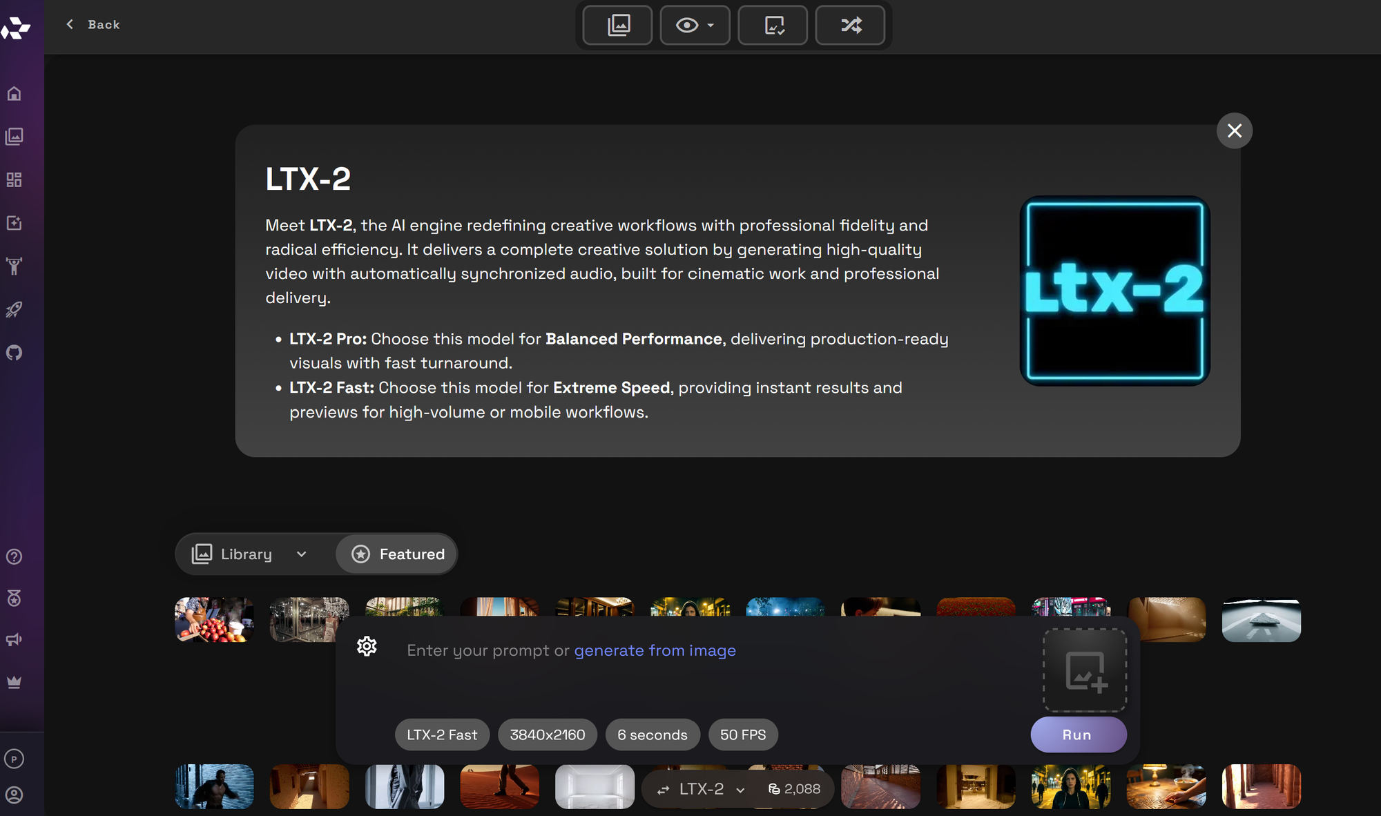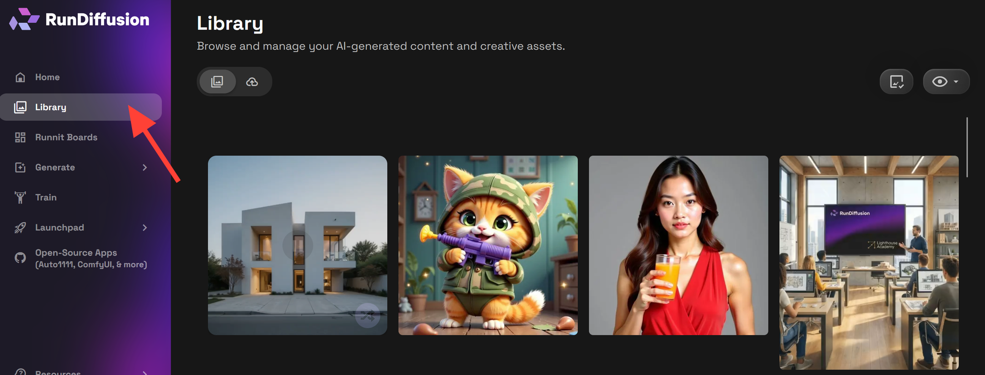 Manage all your AI-generated content from one central location. The Library allows you to browse, preview, download, or delete images and videos from any session.