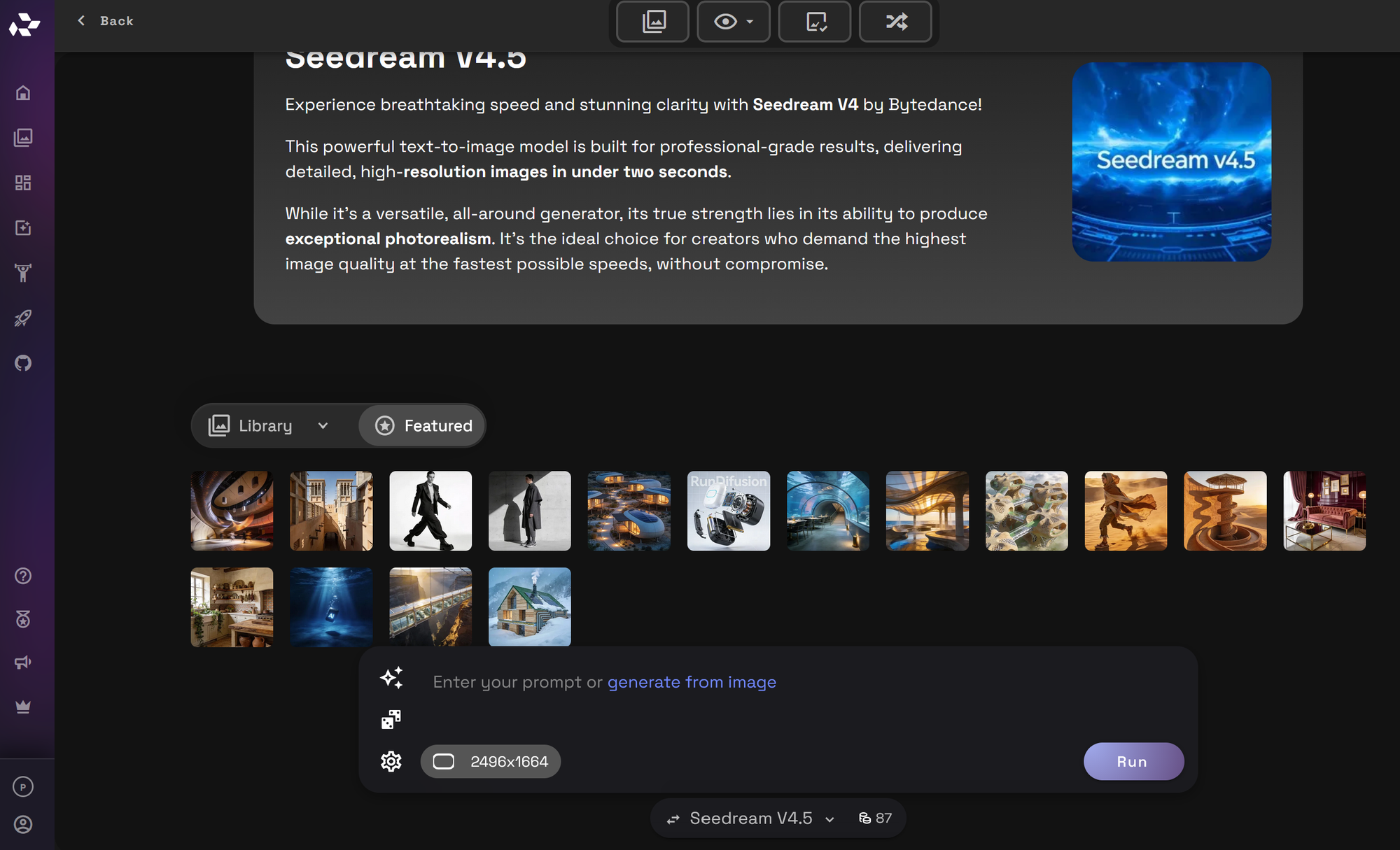 Launch creative apps instantly from within your workspace. Here offers a complete list of Image, Video and Editing models. In addition there are apps which focus on a specific task. All tools are cloud-based and require no setup beyond logging into RunDiffusion.