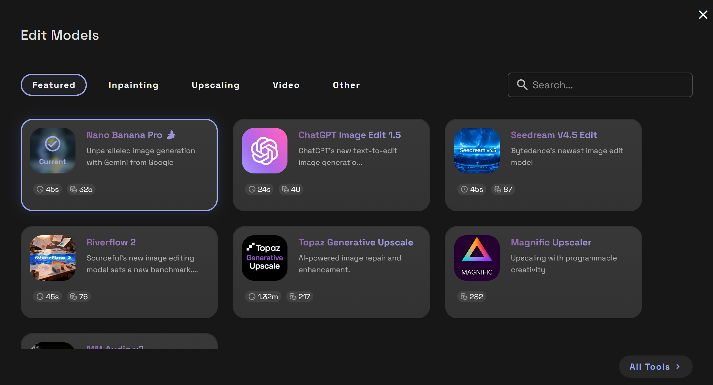 Enhance or modify existing images using prompt-based image editing, inpainting, upscaling, and video editing models.