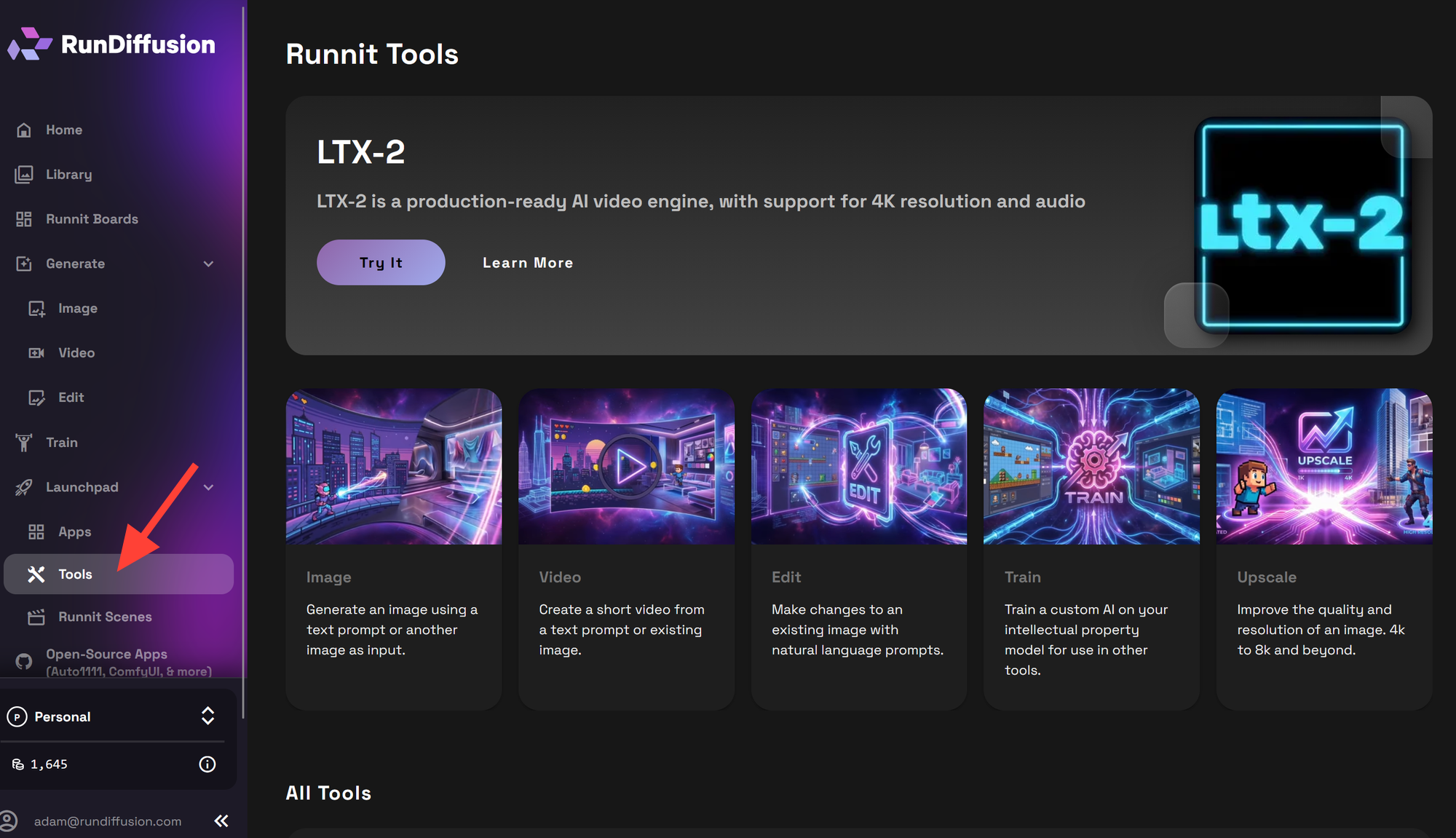 Runnit is used to generate images, create videos, train models, and organize creative projects using AI. All tools run in a browser-based workspace.