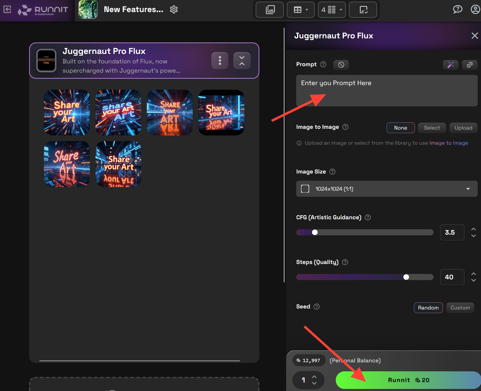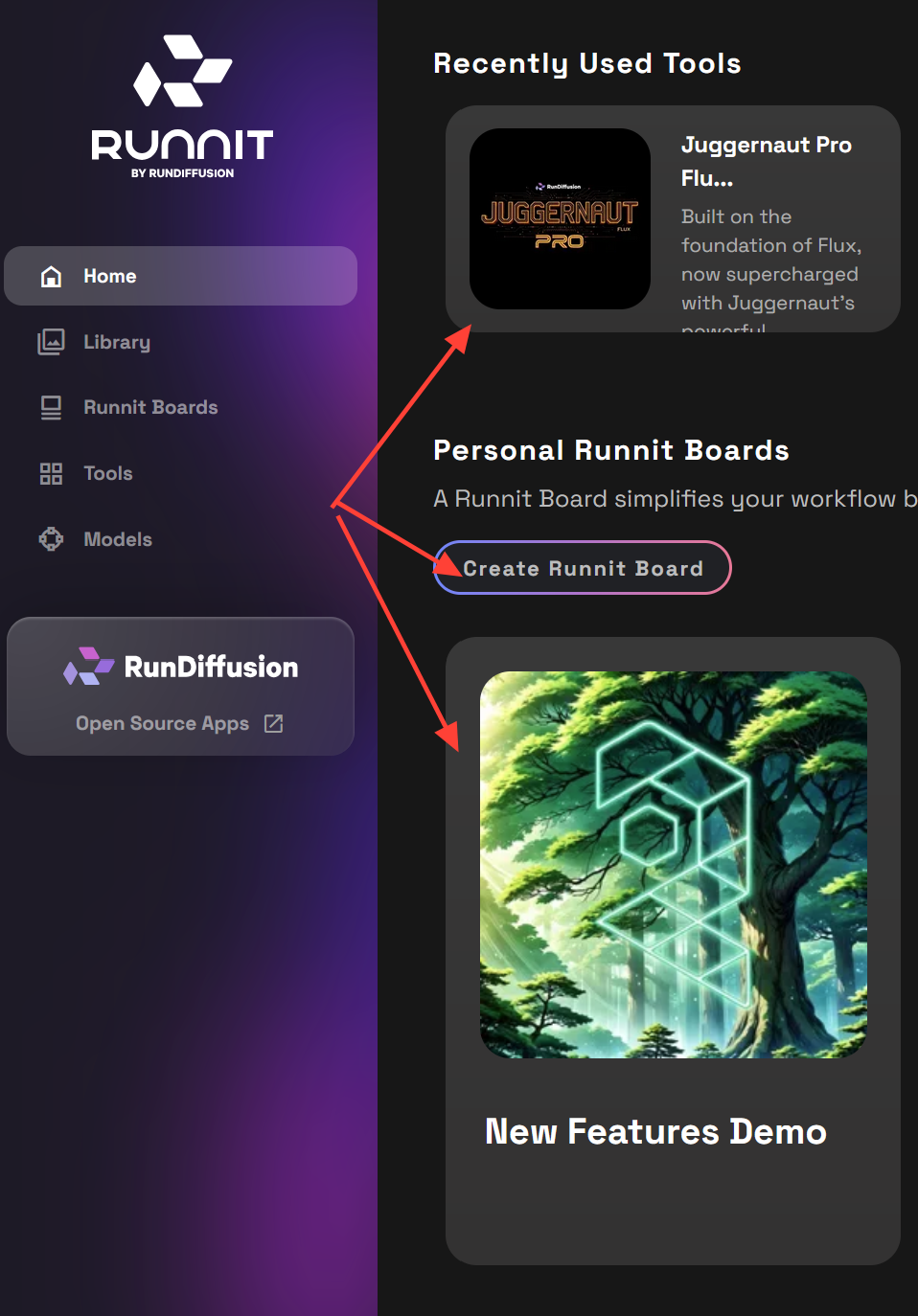 Start by navigating to Runnit by RunDiffusion and accessing a Runnit board where you create and edit your AI-generated images. If you need help creating your first runnit board click on this article.