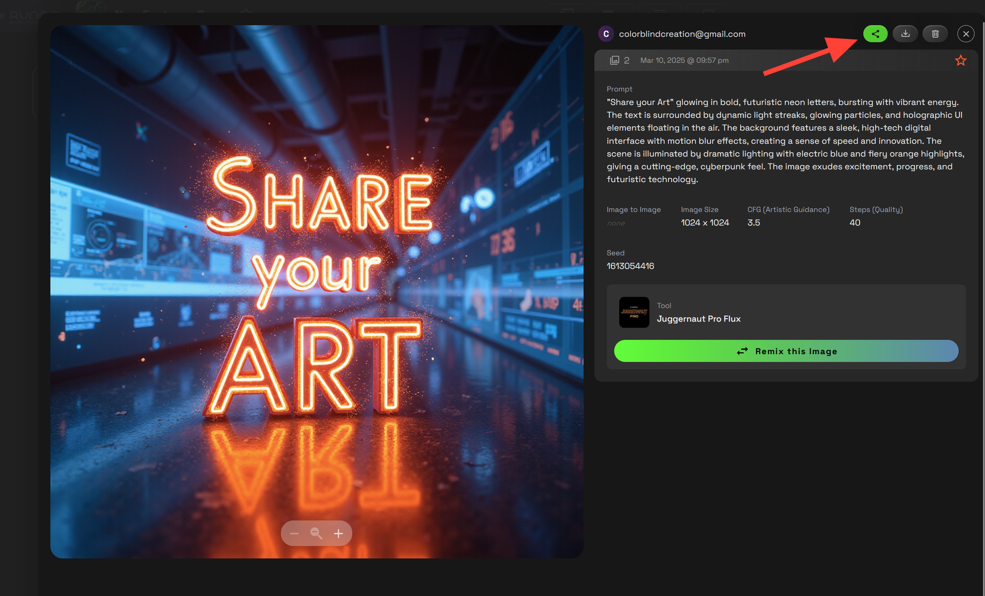 Sharing your AI-generated images just got easier with the new Share feature in Runnit by RunDiffusion. Whether you want to showcase your latest creation or get feedback from your audience, this feature allows you to quickly generate a shareable link and post it on your favorite social platforms.