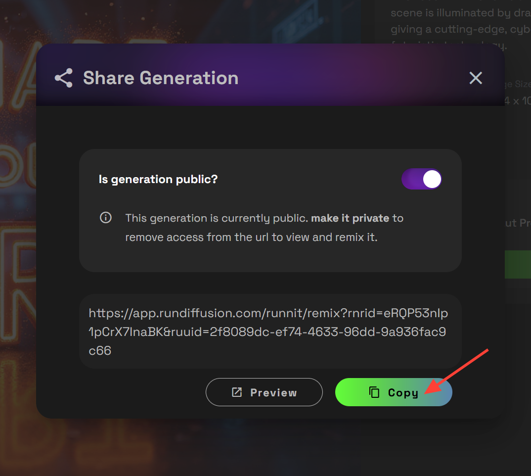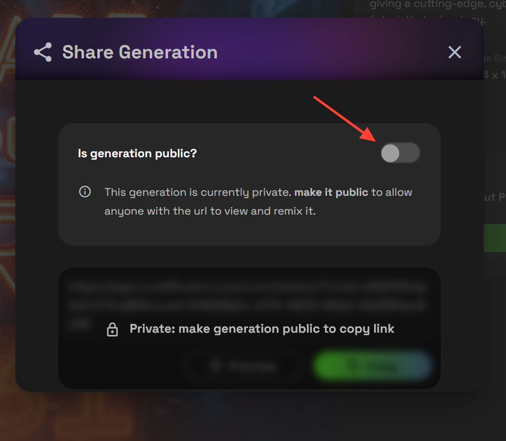 Toggle the "Is Generation Public" then Copy the link and paste it on your preferred social media platforms, including Twitter, Facebook, Discord, or anywhere else you want to showcase your work!