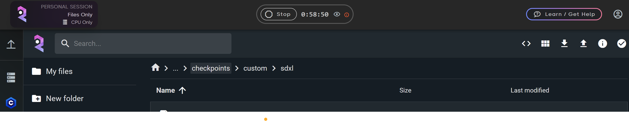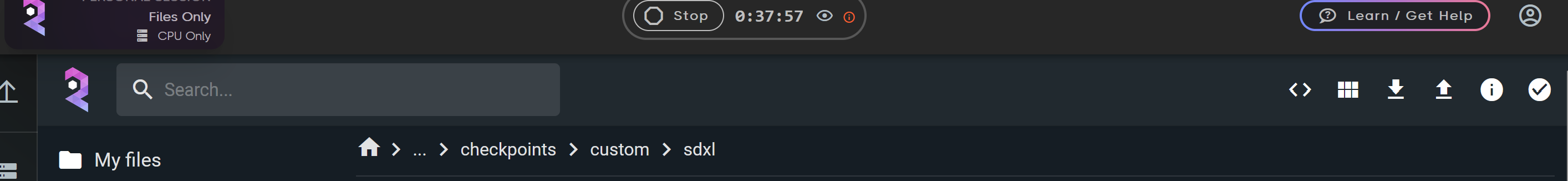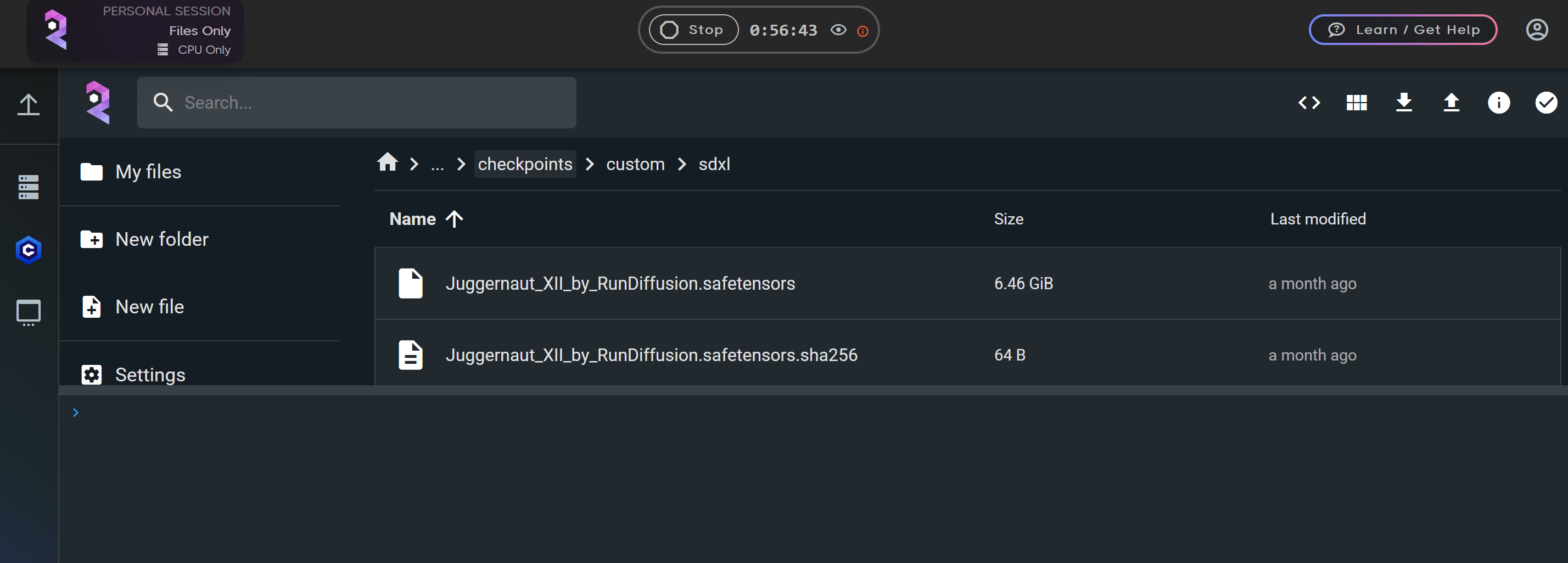 Once you're in the FILES ONLY environment, it is important to open the Console Command within the folder where you want to store the uploaded files. Whether you're uploading checkpoints, LoRA, or any other assets, this step ensures that files are saved to the correct location. If you accidentally upload to the wrong folder you can manually move it later.