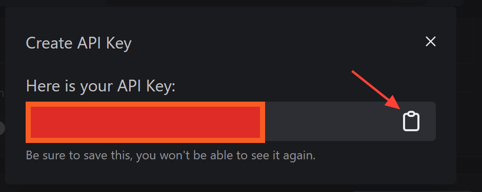 A pop up will then show you your API key. You can click the clipboard symbol to copy it. Save this API key you will need it soon.